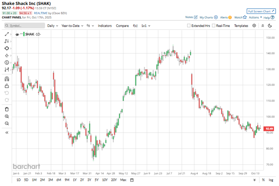 On a year-to-date (YTD) basis, the drawdown is even more substantial, with shares down 26%. Over the past year, SHAK is down by 25%.